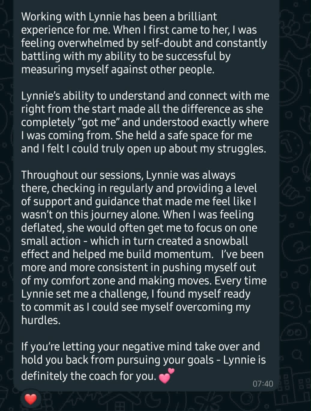 Now, I live free - with peace in my mind and unapologetic in who I am. I’ve built new, healthy habits, achieved more than I ever thought possible, and finally love myself. That’s why I coach women today. Because I’ve been where you are. You don’t have to do it alone. And I know the way out.