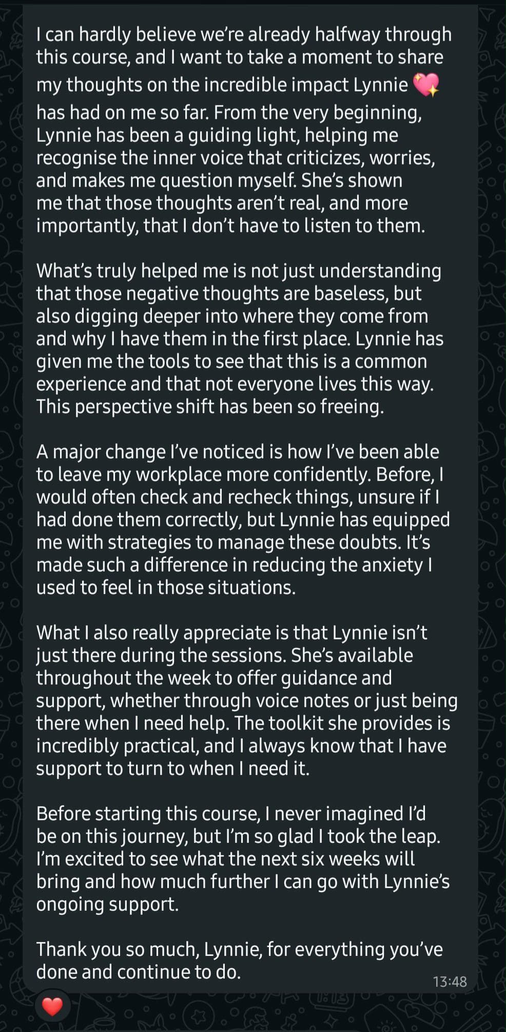 Through my 90-Day Inner Rewire Framework, we go deeper than coping strategies. We get to the root of that voice, dismantle the patterns, and rewire your mind and identity for lasting change.